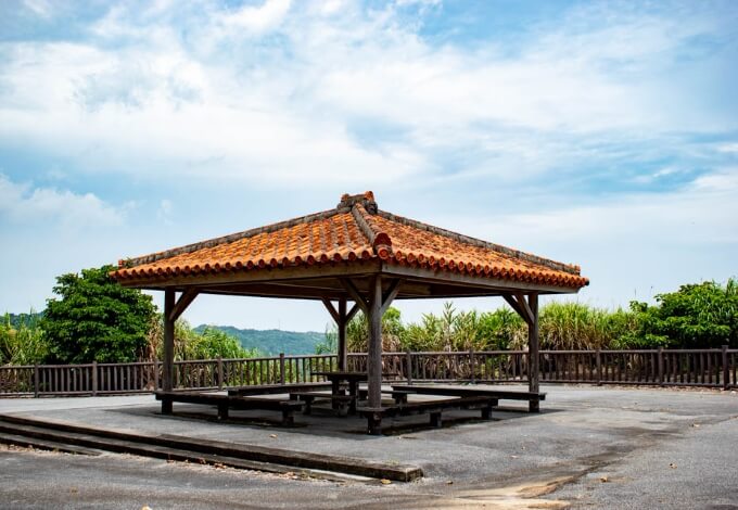 自転車と歩行者専用の道を進むと見えてくる瓦屋根の東屋。この辺りは高台となっているので、見晴らしがとても良く、眼下には南城市の街並みと海が広がります。緑が美しく風が心地よく感じられます。